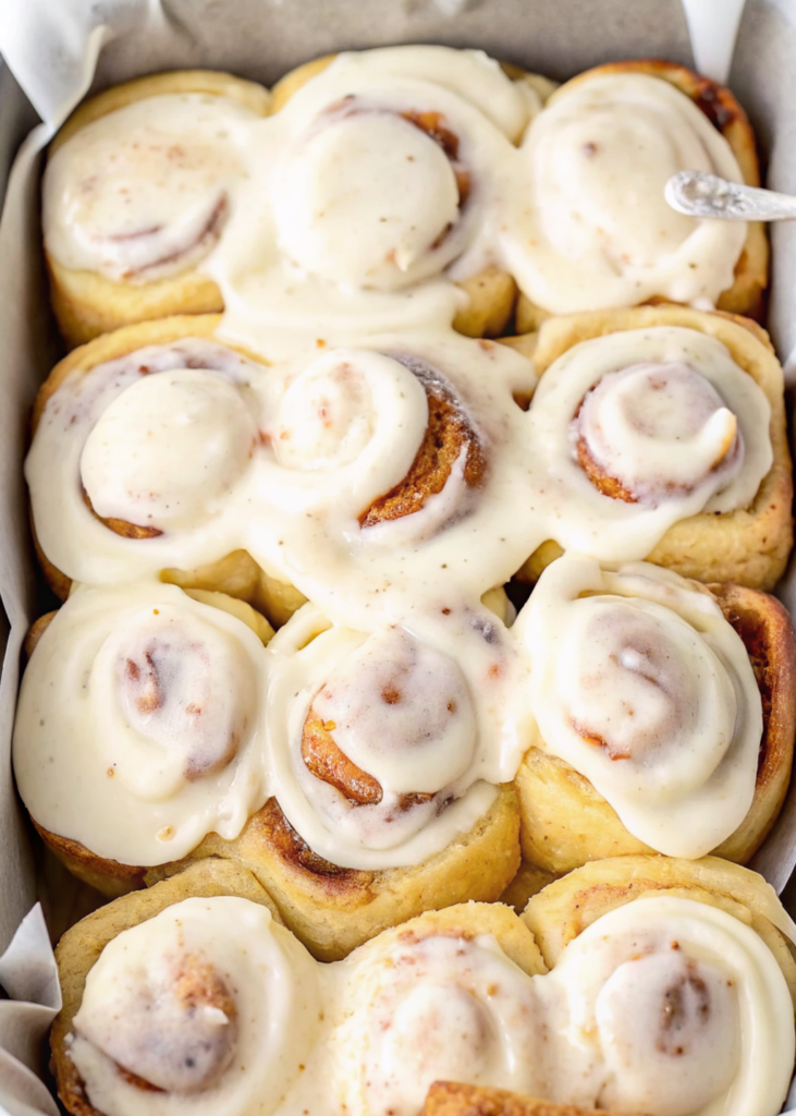 • Cover the rolls and let them rise again for about 30 minutes, until they look puffy. Preheat your oven to 350°F (175°C). Bake the rolls for 25–30 minutes, or until they are lightly golden on top and baked through. While the rolls are baking, whisk together the powdered sugar, eggnog, and vanilla to make the glaze. Pour the glaze over the warm rolls and let it melt into every swirl.
